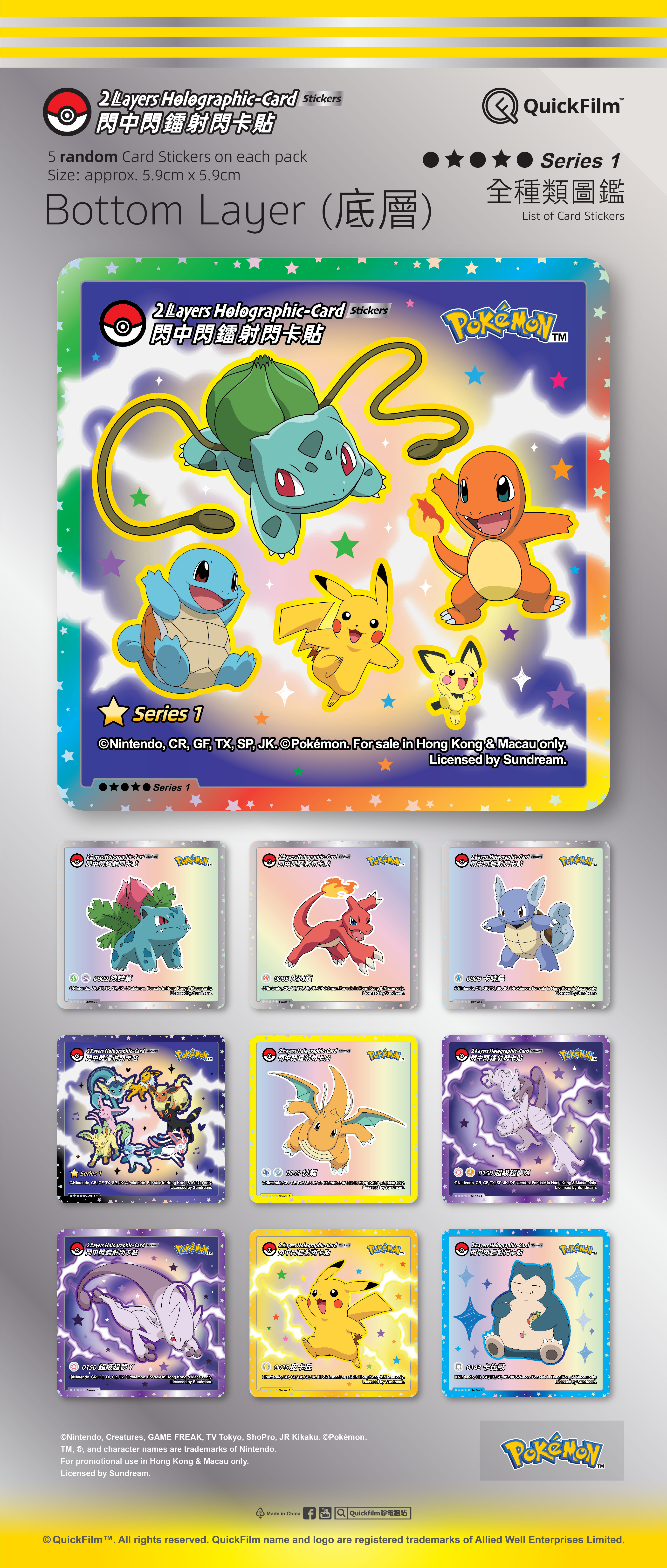 每包閃中閃鐳射閃卡貼內有5張pokemon閃卡, 每張閃卡均有2層, 面層為雷射pokemon貼紙, 撕開pokemon貼紙後揭示底層pokemon收藏閃卡!