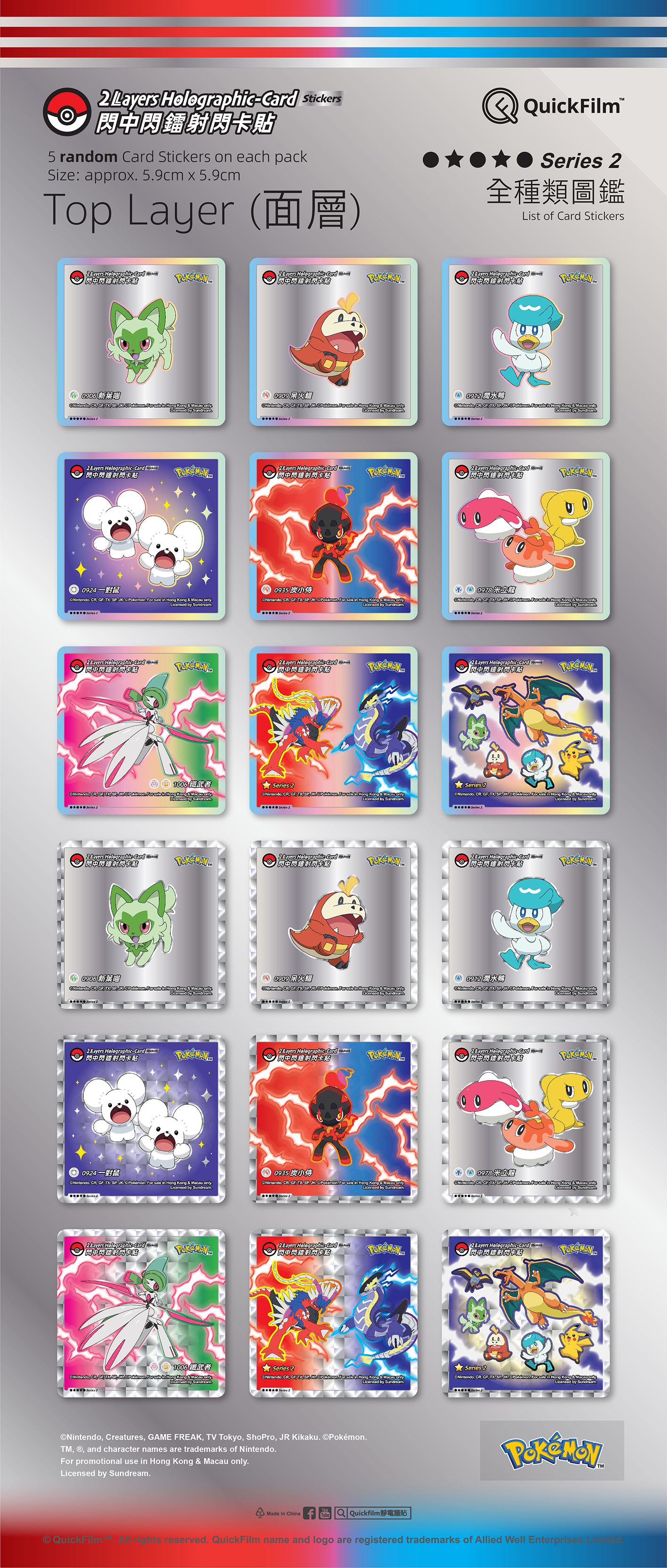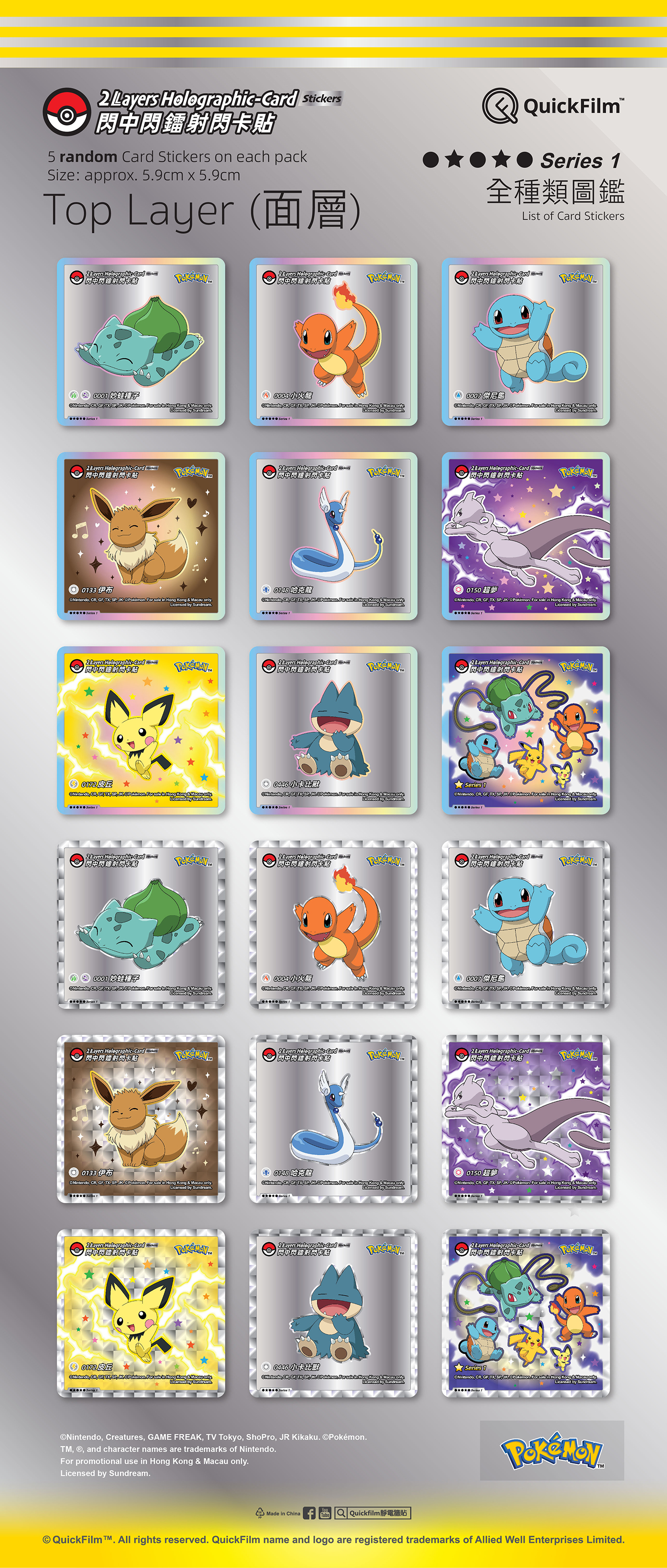 每包閃中閃鐳射閃卡貼內有5張pokemon閃卡, 每張閃卡均有2層, 面層為雷射pokemon貼紙, 撕開pokemon貼紙後揭示底層pokemon收藏閃卡!